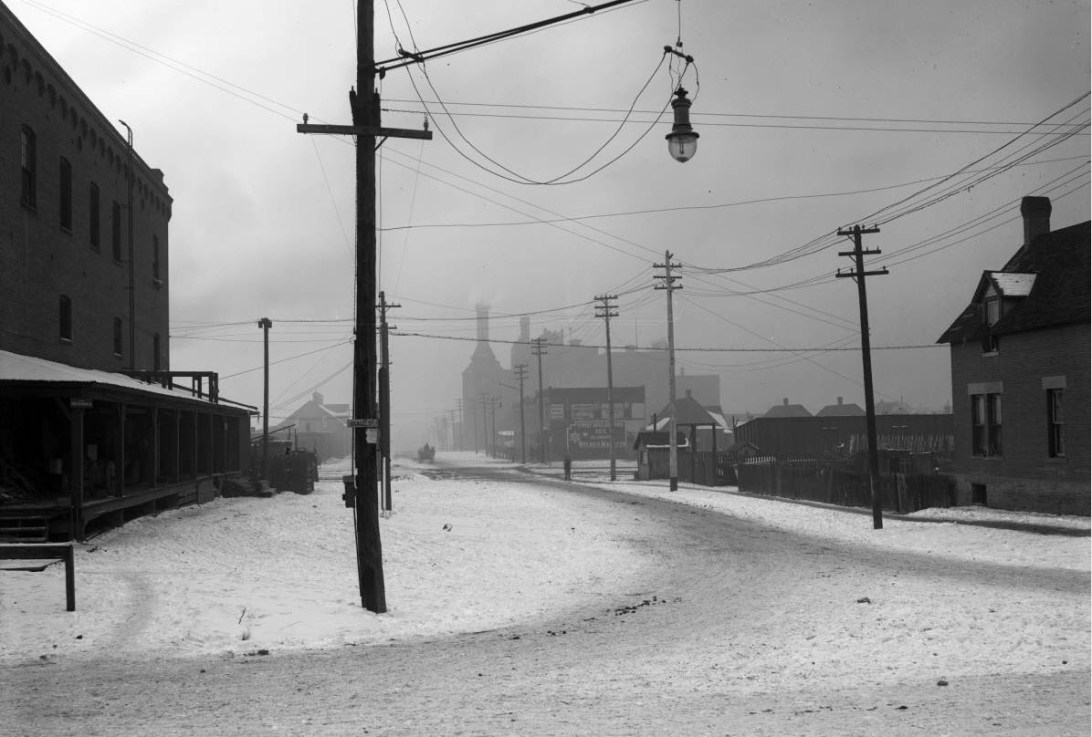 Snowy view of 12th Avenue in Denver, Colorado; shows houses, a street lamp, industrial buildings, and signs: “The Colo Telephone Co.” “Osage St.” “Imported Wines Liquors Cigars” “Hermann Winterer’s Exchange” “Neef Bro’s Brewing Co’s Celebrated Weiner Mar[?]en” and a six-pointed star logo.1910? Courtesy DPL Western History Collection GB-8278