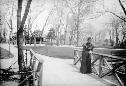 A woman stands on a footbridge that passes over the Merchant’s Mill Ditch at Lincoln Park in the Lincoln Park neighborhood of Denver, Colorado. A covered bandstand is in the distance.