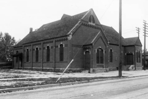 View of the First Seventh-Day Adventist Church at 11th (Eleventh) Avenue and Kalamath Street in the Lincoln Park neighborhood of Denver, Colorado. The brick church as arched windows and decorative trim.