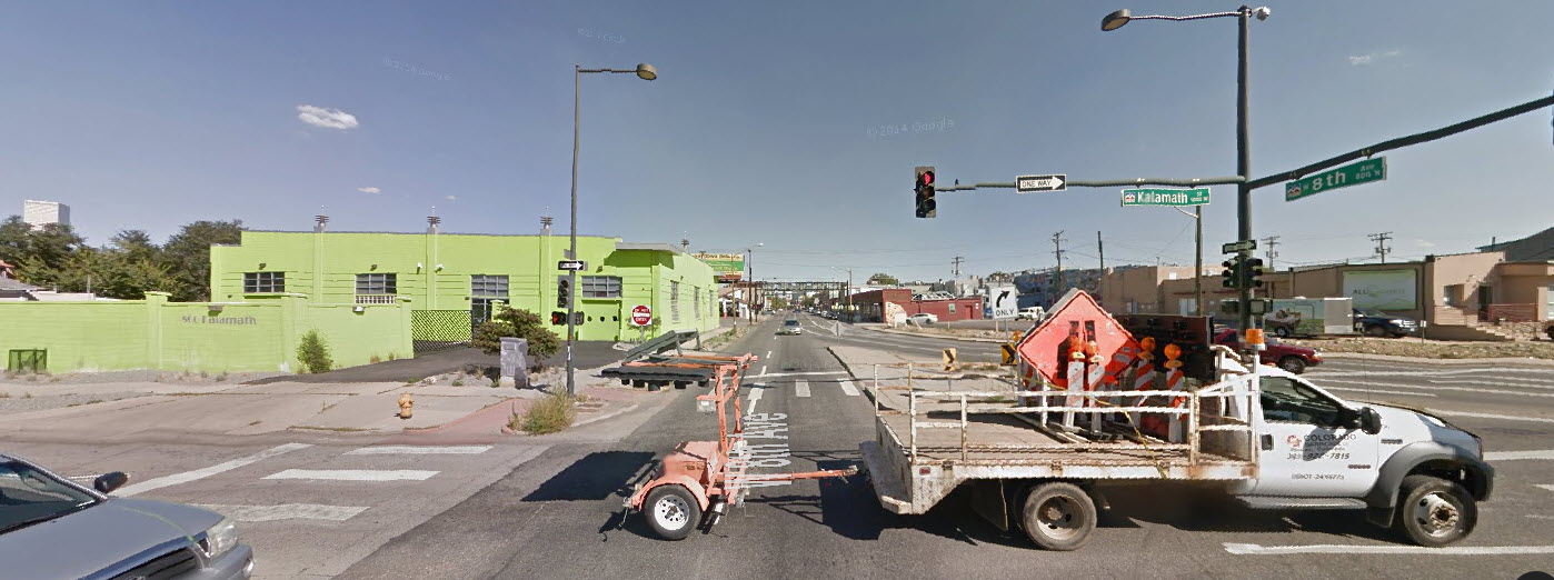 The map below helps place the image. The streetcar lines intersecting at 8th and Kalamath are visible on it.