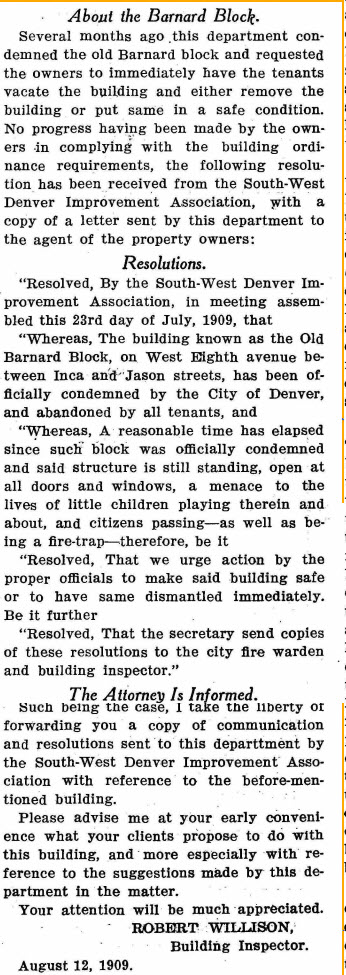 About the Barnard Block, City has Building Condemned from Denver Municipal Facts: Volume 1 Number 29, 1909 September 4. Courtesy DPL Western History Collection C352.078883 D4373mu