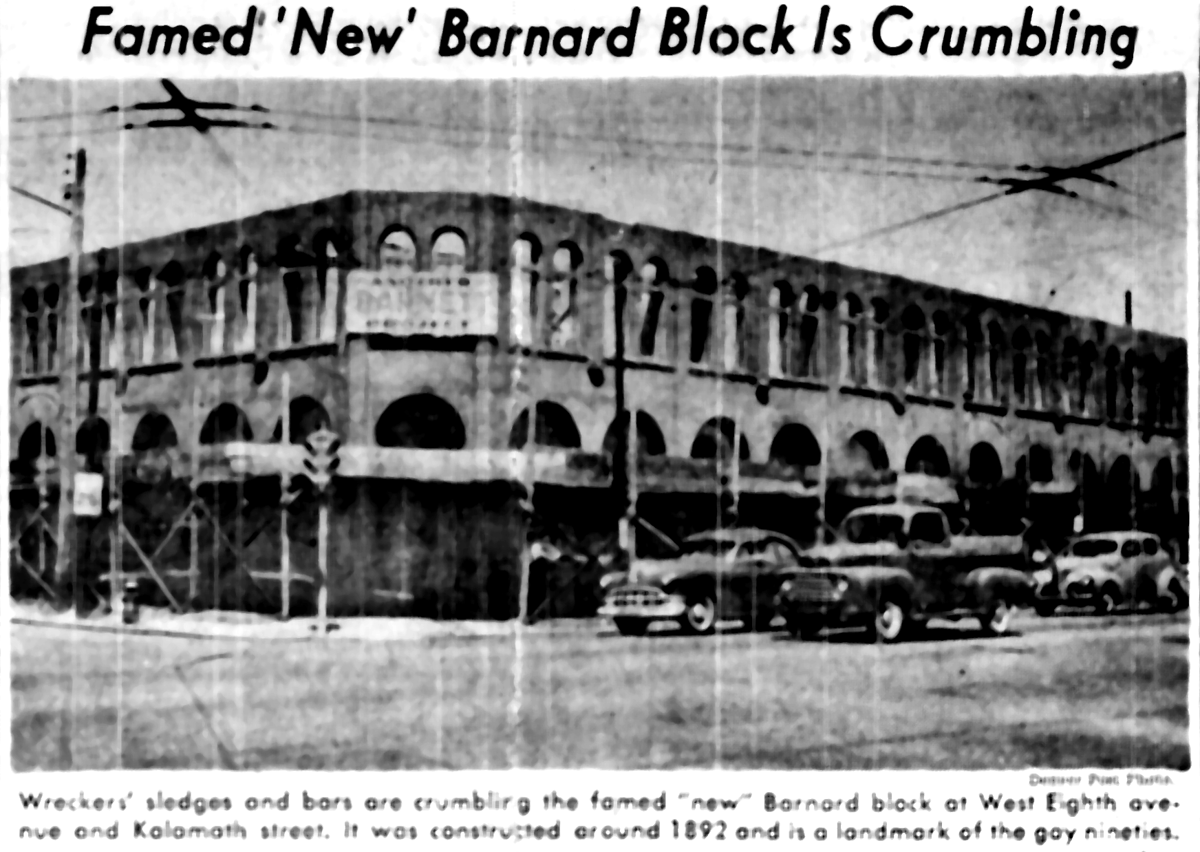 Famed ‘New’ Barnard Block Is Crumbling, Wreckers’ sledges and bars are crumbling the famed “new” Barnard block at West Eighth avenue and Kalamath street. It was constructed around 1892 and is a landmark of the gay nineties. From the Denver Post 1951 AUG 2.