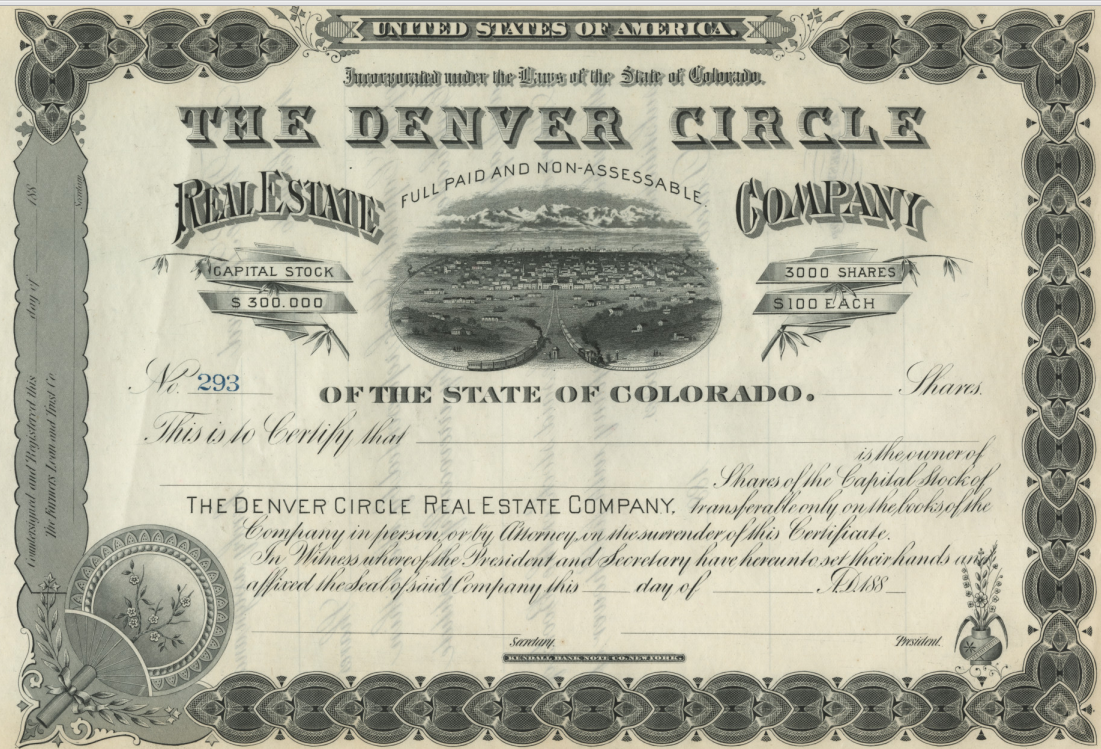 Denver Circle Real Estate Company Stock Certificate. Courtesy DPL Western History Collection WH1503