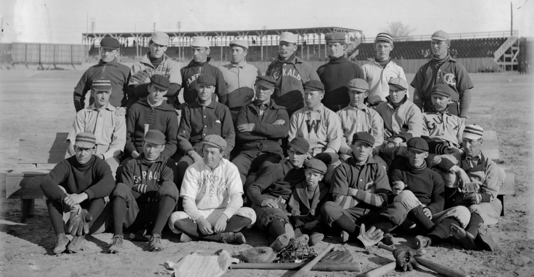 Members of the Denver Bears baseball team pose outdoors at a baseball field in Denver, Colorado. They are identified as: standing: Len “Dad” Shirk, Walter Price (P) Walter Bissell, unknown, “Old Hoss” Hausen (C), Happy “Klondike” Kane (P), J. H. Vizard (OF), Jack Holland (INF & OF). Middle: Pop Eyler (P), Dakin “Dusty” Miller (OF), Tom “Tacks” Parrott (P, OF, INF), Charley Kight (P) Charles “Princeton Charlie” Reilly (3B), Charlie Zeitz (OF), W. E. “Bill” Hickey (INF), Al Hickey (C). Front: Mons “Eddie” Webster (P), Walter “Wizard” Preston (CF), Jack Sullivan, Pearl “Casey” Barnes (INF), Clarence Leisenring, Mascot, Joe Tinker (2B), and W. E. Hurry McNeeley (P & INF). Courtesy History Colorado Collection CHS-B1427