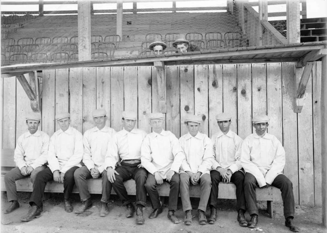 Members of the Denver Bears baseball team pose in a dugout in Broadway Park at 6th (Sixth) Avenue and Broadway in Denver, Colorado. They are identified as (left to right): Earnest “Kid” Mohler (2B), W. A. “Bill” Hickey (IF & OF), Jack Holland (IF & OF), Joe Tinker (IF), Eddie “Kid” Lewee (SS), Charlie Zeitz (OF), Henry Schmidt (P), and unknown. [1900] History Colorado Collection CHS-B1456