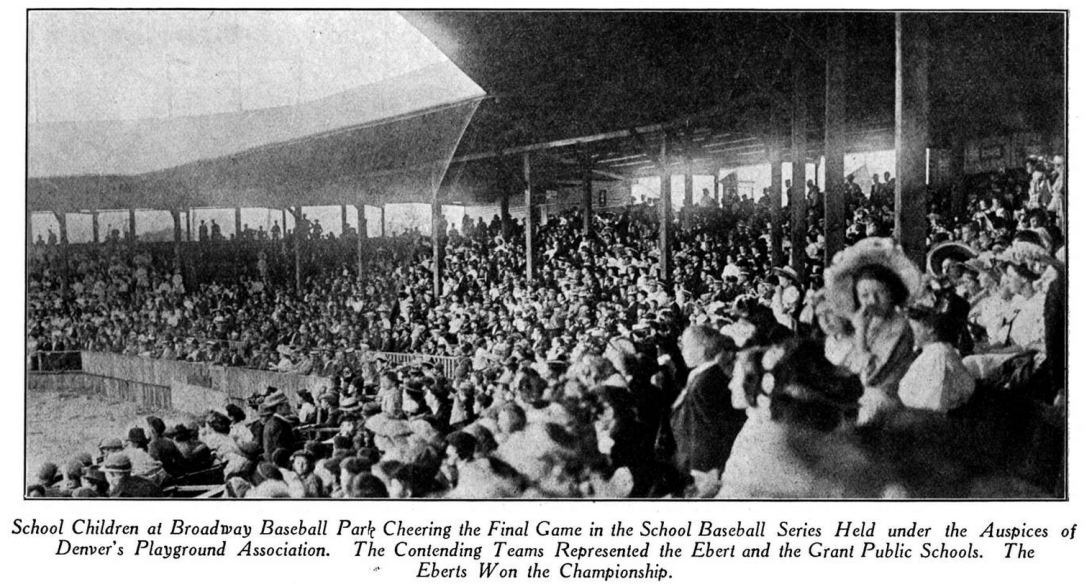 Fans enjoy the School Baseball Series at Broadway Park II. From Denver Municipal Facts 1909 June 19 p12. Courtesy DPL Western History Collection C352.078883 D4373mu.