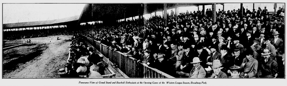 Panorama View of Grand Stand and Baseball Enthusiasts at the Opening Game of the Western League Season, Broadway Park 1910. Courtesy DPL Western History Collection C352.078883 D4373mu