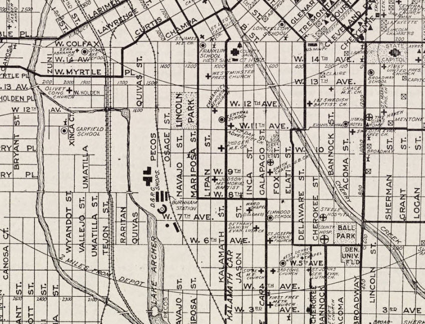 Notes Inset: Enlarged section of Denver’s business district.; Index to street names, list of street names recently changed and explanation of street numbering system below map.; Issued as souvenir of the Democratic National Convention, July 1908. Verso of map contains much tourist information and list of streets below map replaced with pictures of prominent buildings.