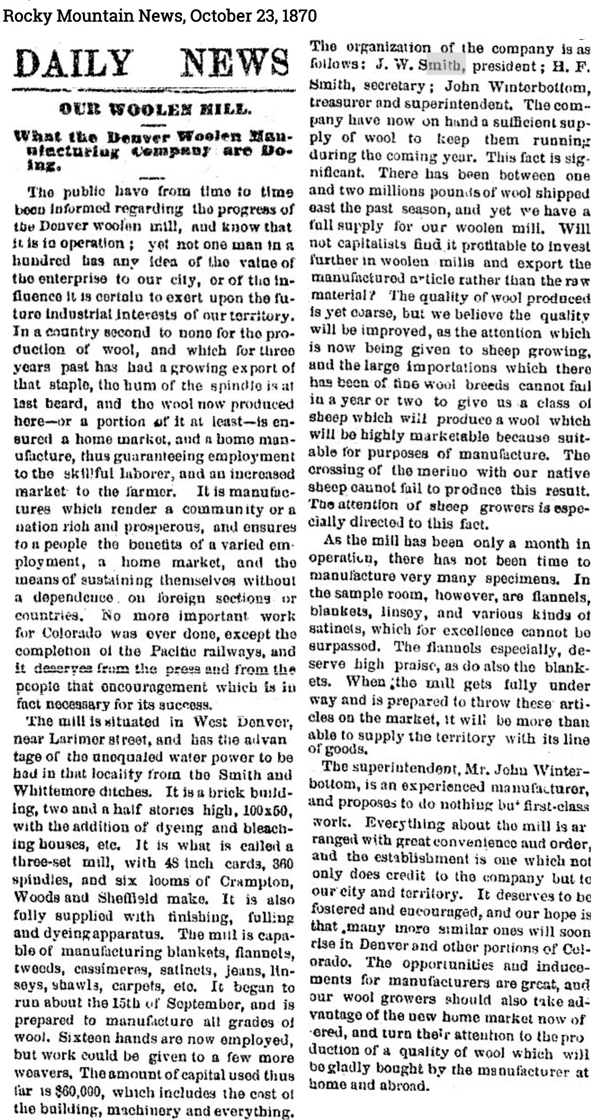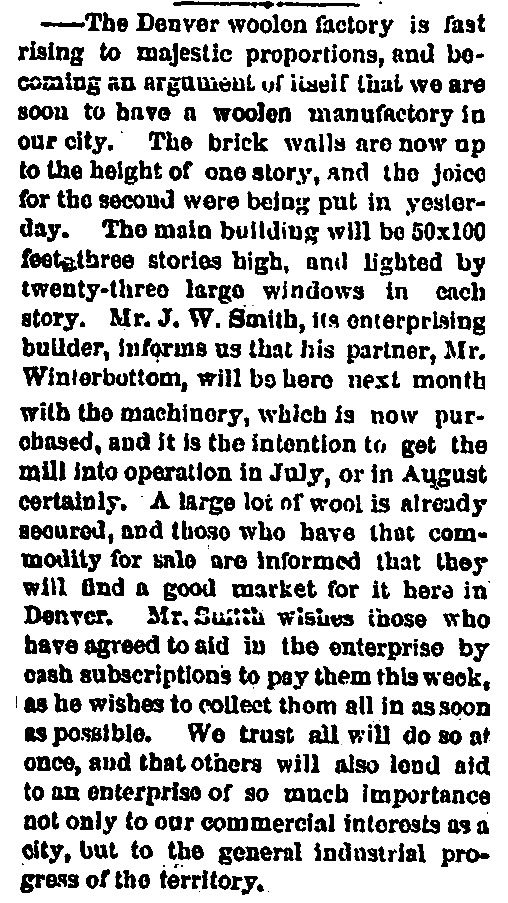 “The superintendent, Mr. Winterbottom, is an experienced manufacturer, and proposes to nothing but first-class work. Everything about the mill is arranged with great convenience and order, and the establishment is one which not only does credit to the company but to our city and territory. It deserves to be fostered and encouraged, and our hope is that many more similar ones will rise in Denver and other portions of Colorado….Mr. Smith wishes those who have agreed to aid the enterprise by cash subscriptions to pay them this week,…We trust all will do so at once, and that others will lend aid to an enterprise of so much importance not only to our commercial interests as a city, but to the general industrial progress of the territory”