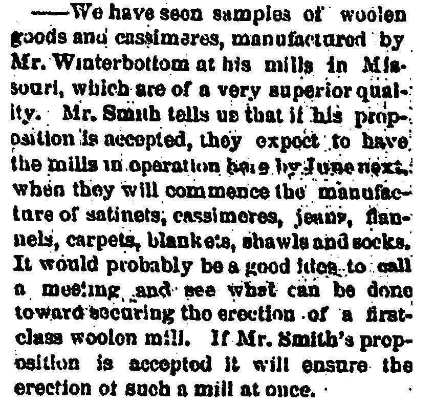 Mr. John Winterbottom would help him manufacture “satinets, cassimeres, jeans, flannels, carpets, blankets, shawls, and socks,” “of a very superior quality,” if Smith could put together enough investors to construct the building.