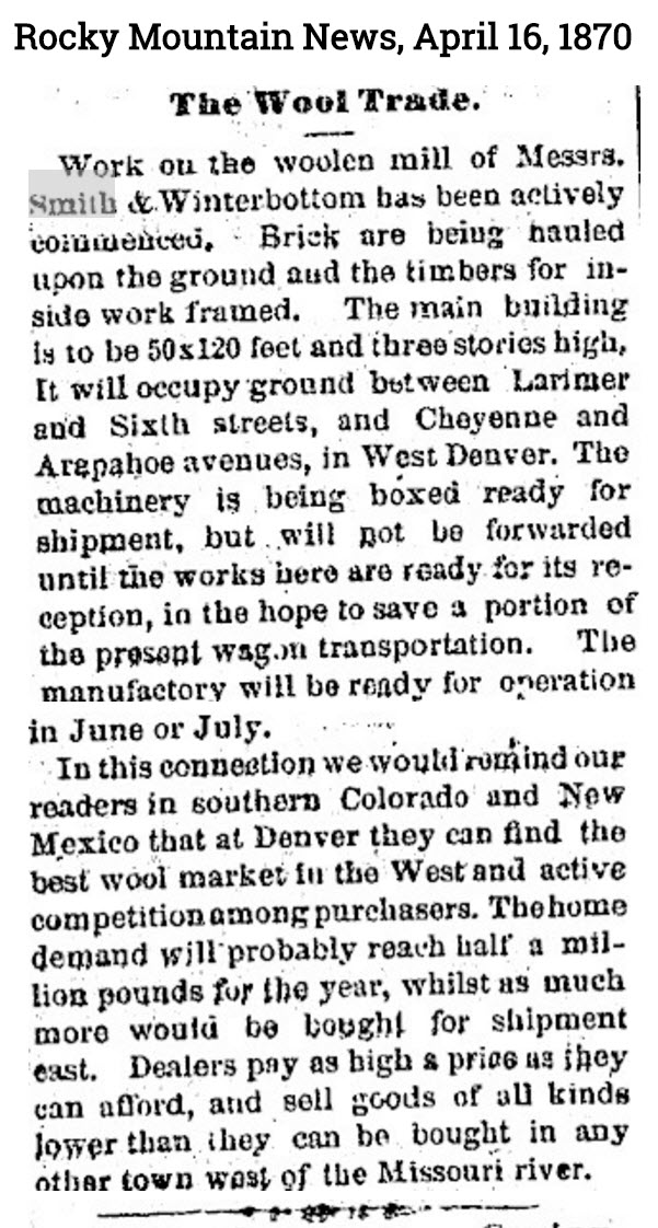 The miller was also among Denver’s pioneer manufacturers, and from his beginning produced an excellent quality of flour, though the early mills were quite different affairs from the two huge establishments now engaged in that business. John W. Smith brought Denver’s first flour-making machine (and also the first in Colorado) when he came here in 1860. It was a small portable buhr grist mill with which he made in that year the first flour and corn meal produced in Colorado. In 1865 Smith erected in “West Denver” a rather large steam flour mill the fuel for which was wood at twenty-five dollars a cord. Disposing of this a year or so later, he built another and much larger mill which he operated by water power obtained from the Union Ditch Company’s hydraulic canal that had been constructed in “West Denver” in 1864, and taking water from the Platte river some distance above the town. In 1874 Smith built still another and still larger mill—the Excelsior Mill— still in operation at Eighth and Lawrence streets and which in 1879 he sold to J. K. Mullen who later built the present great Hungarian Mills. .. The pioneer conditions in Denver and Colorado were discouraging to the early efforts of manufacturers. Every movement was attended by extraordinary expense, the heaviest of which was the cost of transportation—getting materials into Denver, or into the Territory, and then getting the finished products out to the customers, most of whom were located in places rather difficult of access. These circumstances naturally and necessarily circumscribed the pioneer manufacturers. The coming of railroads in 1870 greatly relieved the transportation situation, but there was no marked expansion of manufacturing in Denver until later in that decade. In 1870 John W. Smith and John Winterbottom built and began operating  a rather large woolen mill making rough flannels, blankets and yarns; their building having been on the south side of Larimer street, near the “mill ditch” in “West Denver.” But the business did not permanently prove profitable. Conditions of 1873 embarrassed it, and in 1877 it was discontinued. This was, we believe, the first and only woolen mill in Colorado. The machine shops and flour mills at that time were the more important manufacturing interests.”