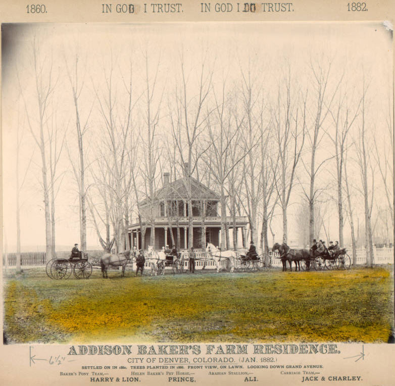 Home of Mr. Addison Nathan Baker on Grand Avenue (West Colfax Avenue) in Denver, Colorado. The farm house is a two-story brick structure with a wrap-around porch. Family members sit in horse drawn carriages. Title and “City of Denver, Colorado. Settled on in 1860. Trees planted in 1866. Front view, on lawn. Looking down Grand Avenue. Baker’s pony team, Harry & Lion. Helen Baker’s pet horse, Prince. Arabian stallion, Ali. Carriage team, Jack & Charley.” and “1860, In God I trust, In God I do trust, 1882.” DPL Western History Collection X-19780