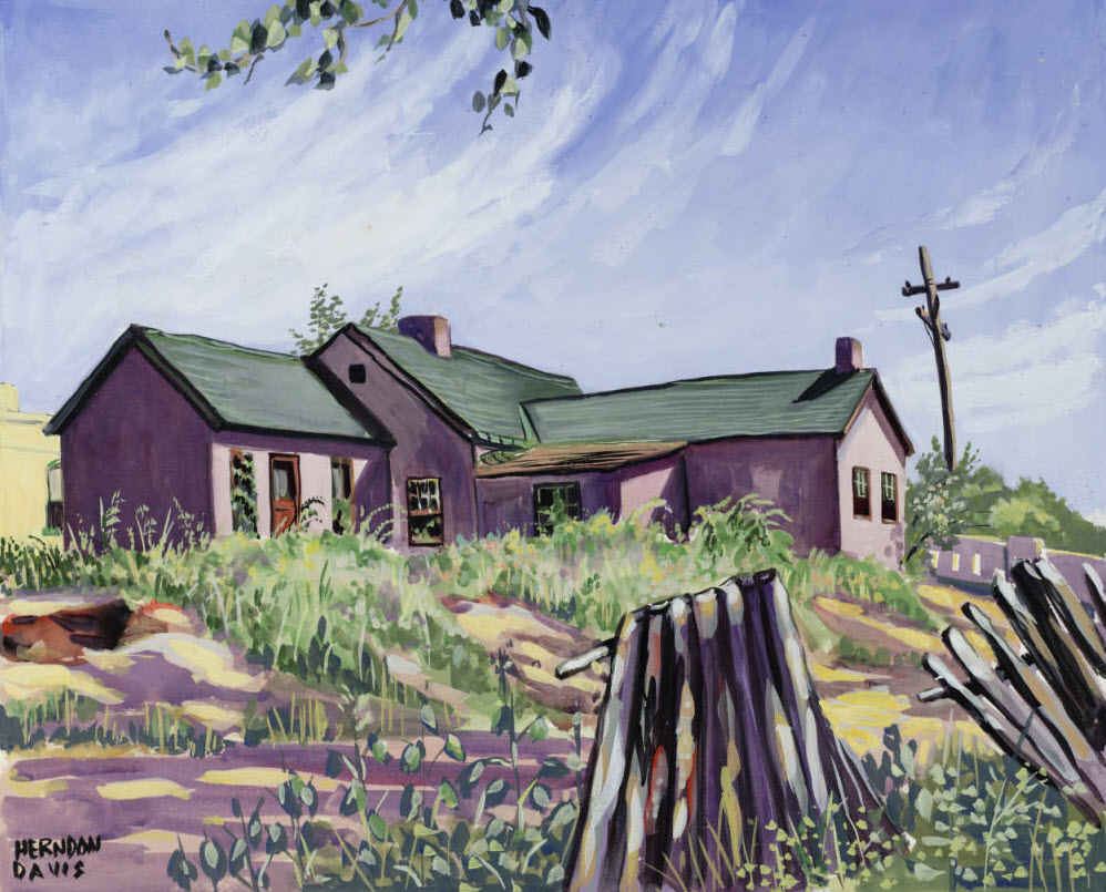 This watercolor and gouache painting shows a Camp Weld cottage at West Eighth (8th) Avenue and Vallejo Street, in Denver, Colorado. This was the home base of the First Regiment of the Colorado Volunteer Infantry during the Civil War.1940. DPL Western History Collection Z-2934; C41-8 ART