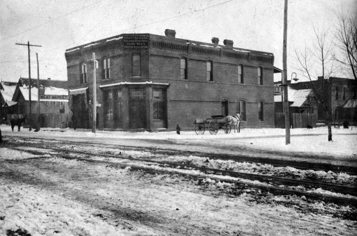 Denver, building. View shows a two story brick building and a horse drawn wagon in snow, Denver, Colorado. Sign on building reads: “Denver and Rio Grande Railroad Department Young Men’s Christian Association.” Next door: “Meat Market.” 1040 W 8th Ave, SW corner of 8th and Lipan.