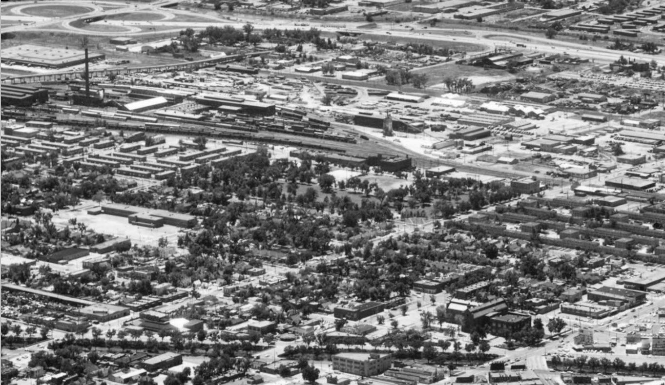 Aerial view of downtown Denver, Colorado. Shows Mile High Center, Trinity Methodist Church, Central Presbyterian Church, Brown Palace Hotel, Farmers Union Building, Continental Hotel, Continental Oil Building, Republic Building, First National Bank Building, Mountain States Telephone Building, Denver Gas and Electric Building, Denver City Auditorium, May D & F, Hilton Hotel, Petroleum Building, Denver City and County Building, Carnegie Building, and Civic Center. The Auraria Neighborhood and Lincoln Park Neighborhood are in the distance. DPL Western History Collection X-29146