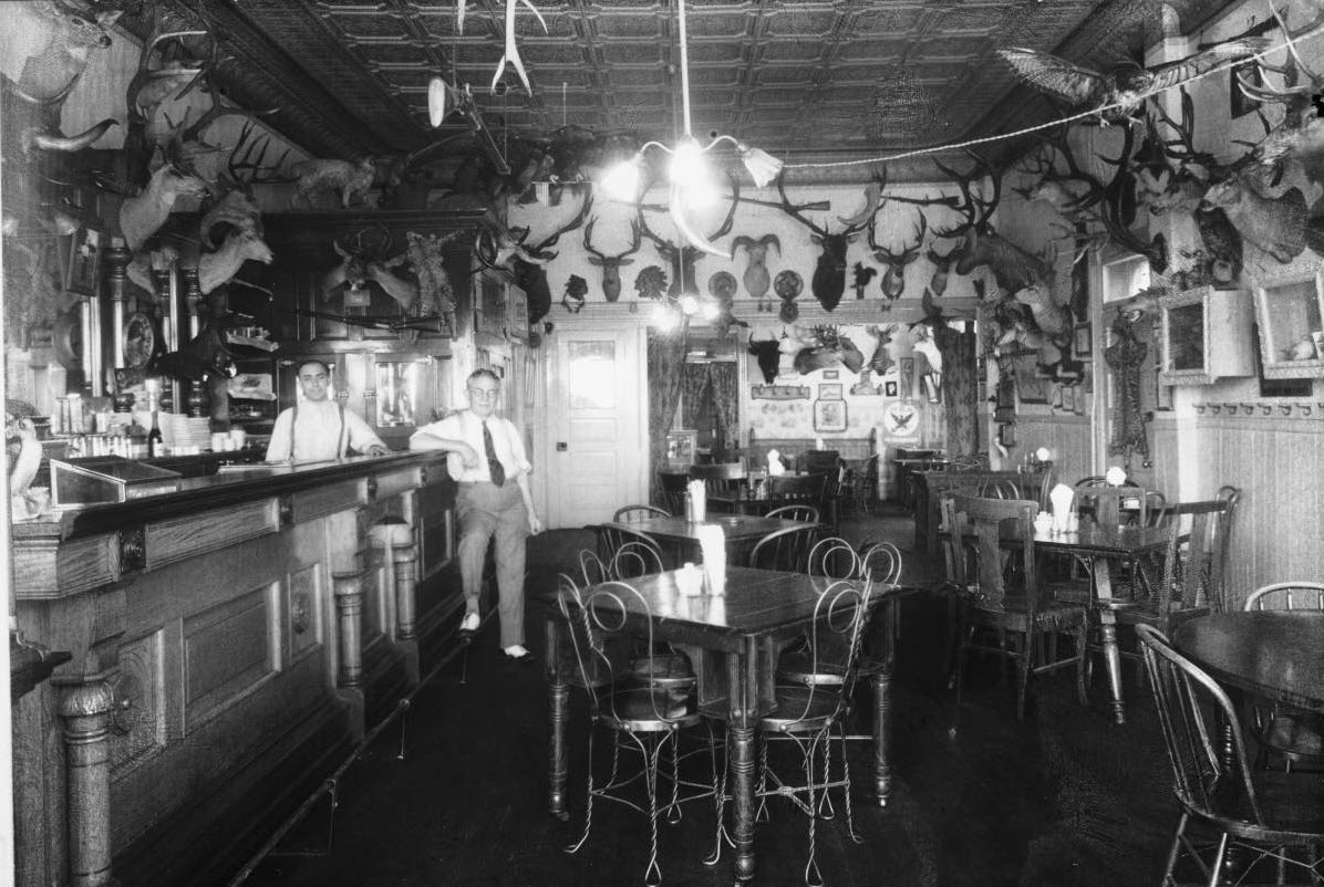 Men pose in the Elkhorn Beer Parlor at 1000 Osage Street in the Lincoln Park neighborhood of Denver, Colorado. Taxidermied animals that include deer, elk, and bighorn sheep are on the walls. A bar, bottles, cigar humidor, and tables are in the room. 1934 August.Rocky Mountain Photo Company.DPL Western History Collection X-25713