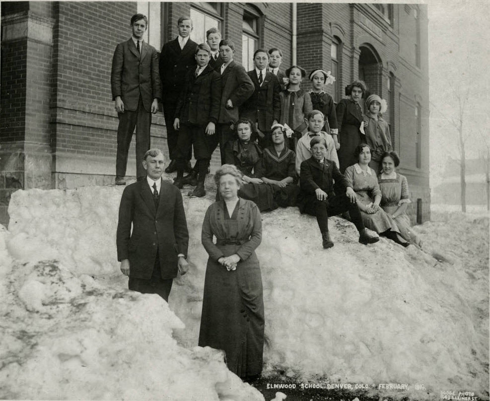 Photograph of Elmwood School staff and students are standing outside of the school on piles of snow in Denver, Colorado. 1914 February DPL Western History Collection WH1990