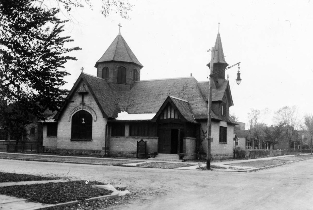 View of Emanuel Memorial Episcopal Church at 12th (Twelfth) Avenue and Lipan Street in the Lincoln Park neighborhood of Denver, Colorado. The brick church has octagonal bell towers and an arched window.[between 1920 and 1930?] DPL Western History Collection X-25653