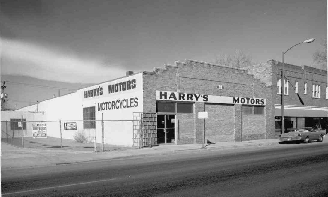 Whitacre, Roger.Summary View of Harry’s Motors, a commercial building at 965 Santa Fe Drive in the Lincoln Park neighborhood of Denver, Colorado. The brick building has a stepped parapet and is painted to read “Harry’s Motors, Motorcycles.” Shows a fence around a paved parking area and signs that reads: “Champion” and “For Lease, Shames Makovsky Realty Co.” A convertible automobile is parked on the street. 1991 FebruaryDPL Western History Collection Z-10743