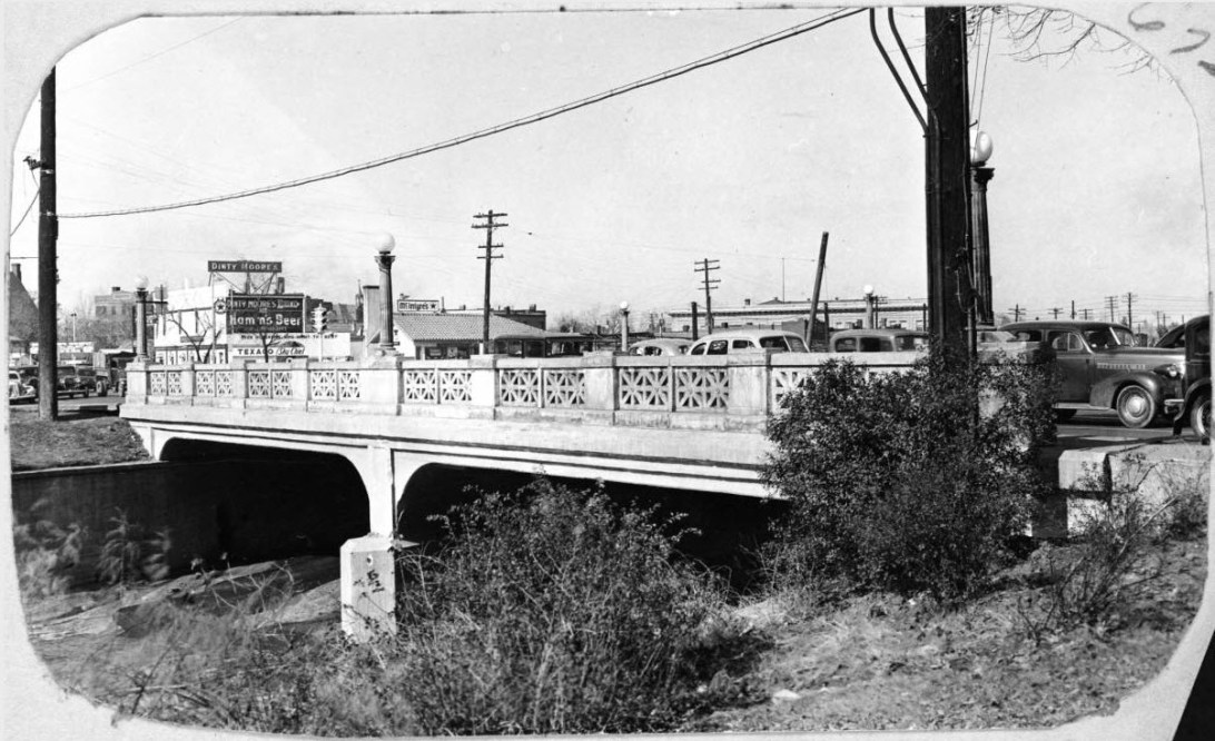 Automobiles cross over the Cherry Creek on the concrete bridge at West Colfax Avenue in Denver, Colorado. The bridge features decorative concrete railing. Shows utility poles, lamp posts and local businesses. Signs read: “Dinty Moore’s”, “McIntyre’s” and “Texaco”[between 1930 and 1940?]Courtesy DPL, Western History Collection X-20754