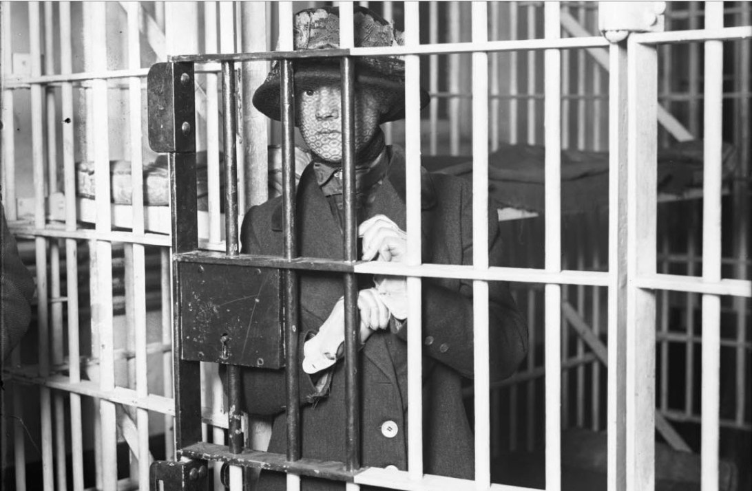 An unidentified, young woman stands inside a jail cell in Denver, Colorado. She wears a hat with a lace veil, a wool coat and gloves. Rhoads, Harry Mellon [1910?] History Colorado Collection Rh-709
