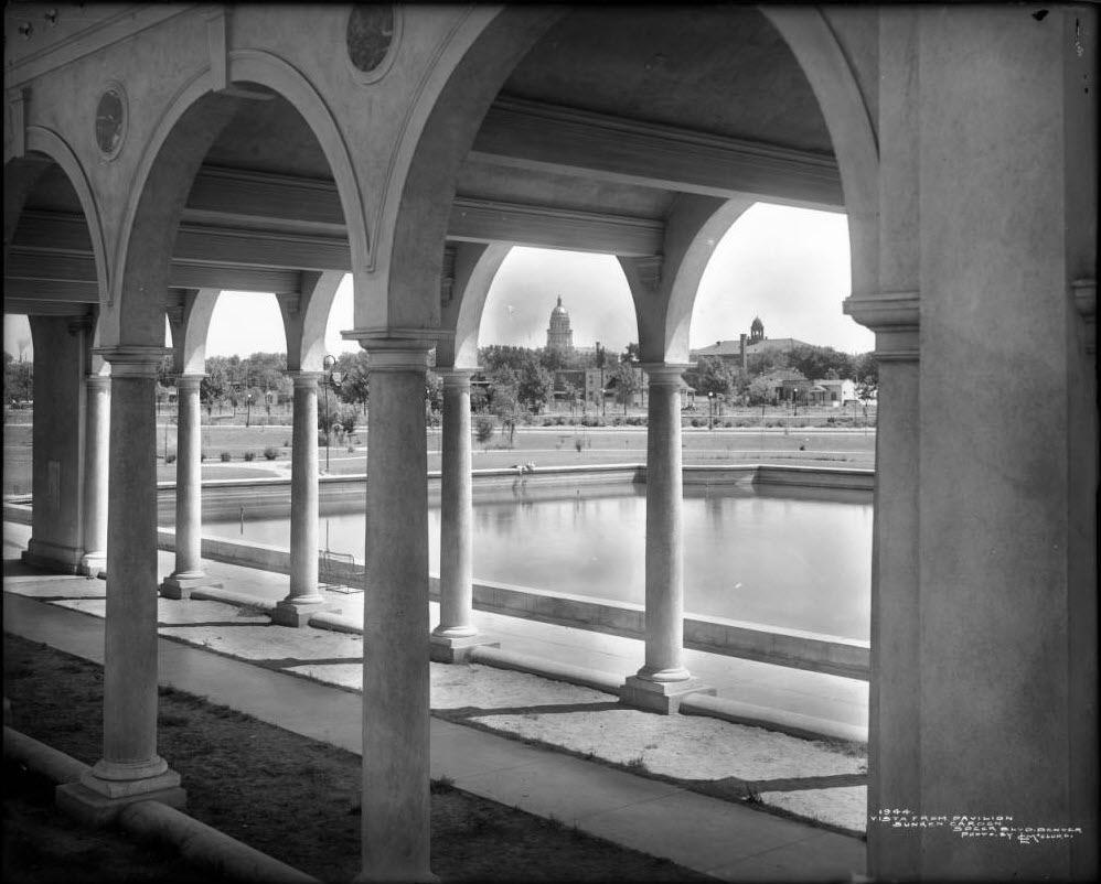 View toward Denver skyline from inside pavilion’s archways, Sunken Gardens, near Speer Boulevard, Denver, Colorado, with raised pond or lake with cement walls; skyline includes Evans School at Eleventh (11th) and Acoma, Colorado State Capitol with gold dome and rotunda, and residences fronting park. [between 1911 and 1920] DPL Western History Collection MCC-1944
