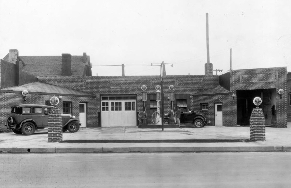 An African American man prepares to refuel a woman’s convertible automobile at the Sinclair filling station at 8th Avenue and Santa Fe in the Lincoln Park neighborhood of Denver, Colorado. A man sits in his automobile nearby. Signs read: “Sinclair H C Gasoline.” Courtesy Western History Collection X-24219